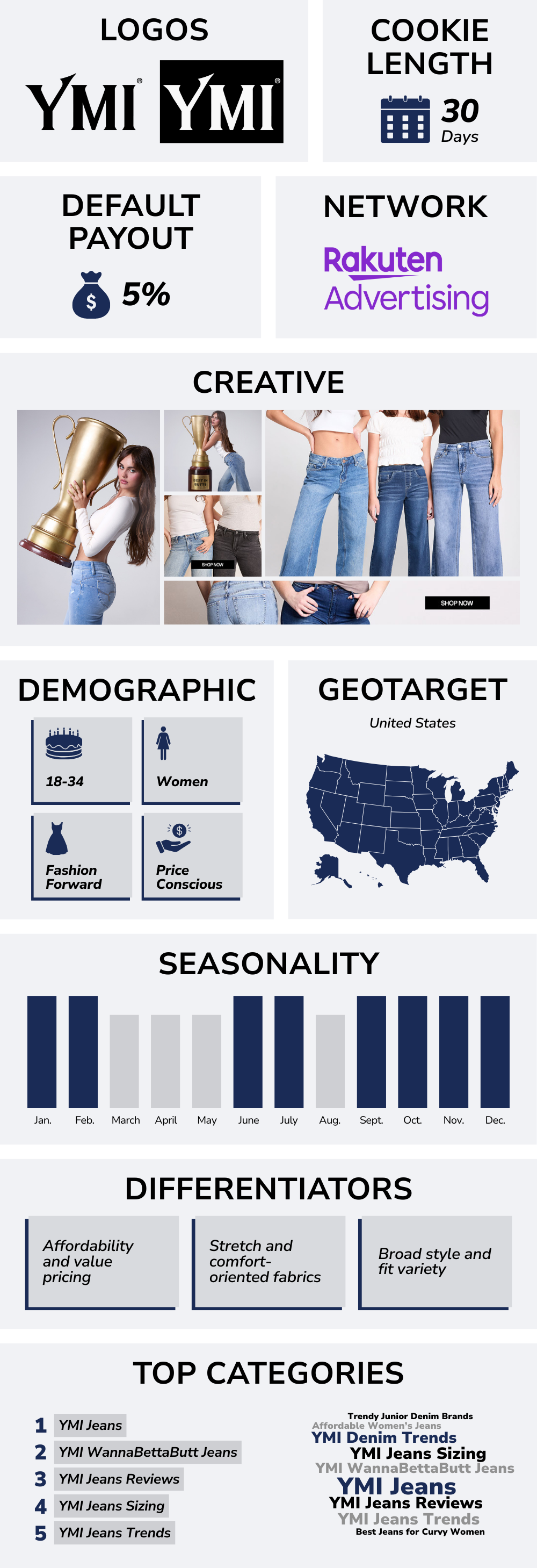 YMI Jeans’s diverse portfolio offers a strong appeal to various audiences. The iconic WannaBettaButt and Hyperstretch lines are fan favorites, while Royalty For Me delivers chic styles for women and YMI Girls provides fun fits for kids. YMI’s accessible price point and continuous innovation in design and sustainability make it a high-converting brand for publishers in the fashion and lifestyle space.