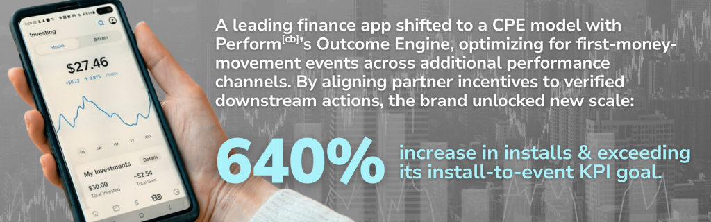 Perform[cb]’s Outcome Engine drives performance-based user acquisition for hundreds of finance apps, providing visibility into high-intent audiences, placements, and partners. By layering new performance channels alongside what you’re already running, you’re not disrupting what works – you’re adding a proven path to incremental scale that you haven’t tapped into yet. It’s scaling without the growing pains.